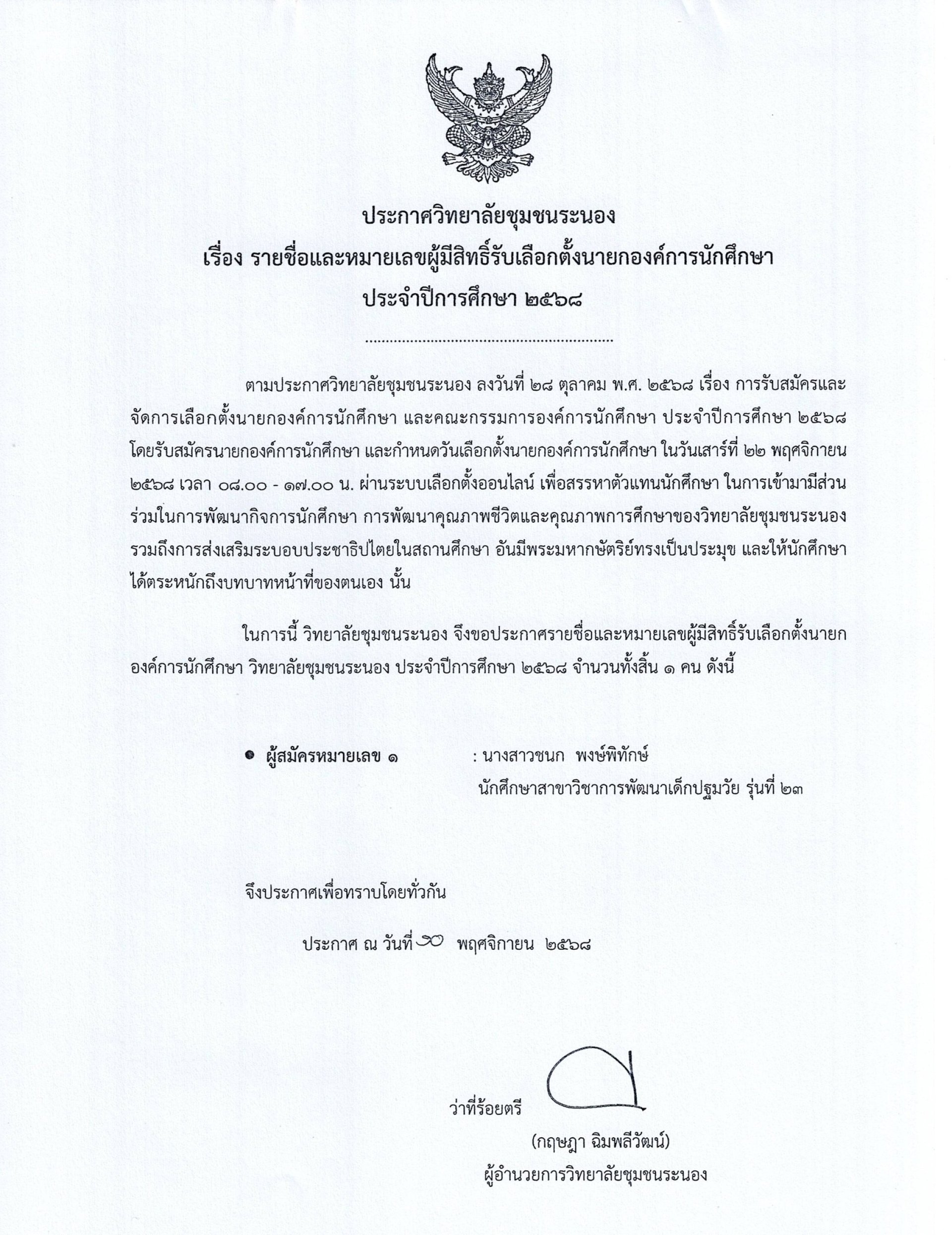 ประกาศรายชื่อหมายเลขผู้มีสิทธิ์รับเลือกตั้งนายกองค์การนักศึกษา ประจำปีการศึกษา 2568