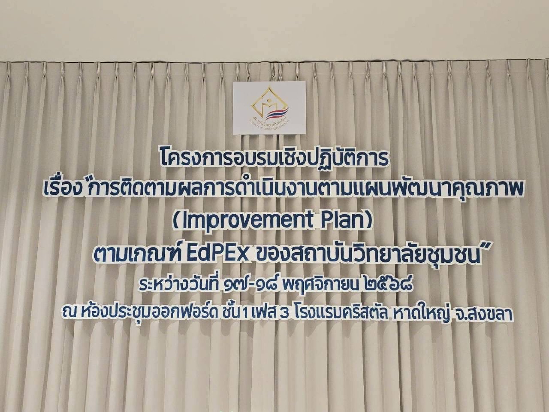 ตามเกณฑ์ EdPEx ของสถาบันวิทยาลัยชุมชน จัดโดย สถาบันวิทยาลัยชุมชน ระหว่างวันที่ 17-18 พฤศจิกายน 2568 ณ ณ โรงแรมคริสตัล หาดใหญ่ จังหวัดสงขลา เพื่อเตรียมความพร้อมในการจัดทำรายงานผลการประเมินคุณภาพภาพฯ