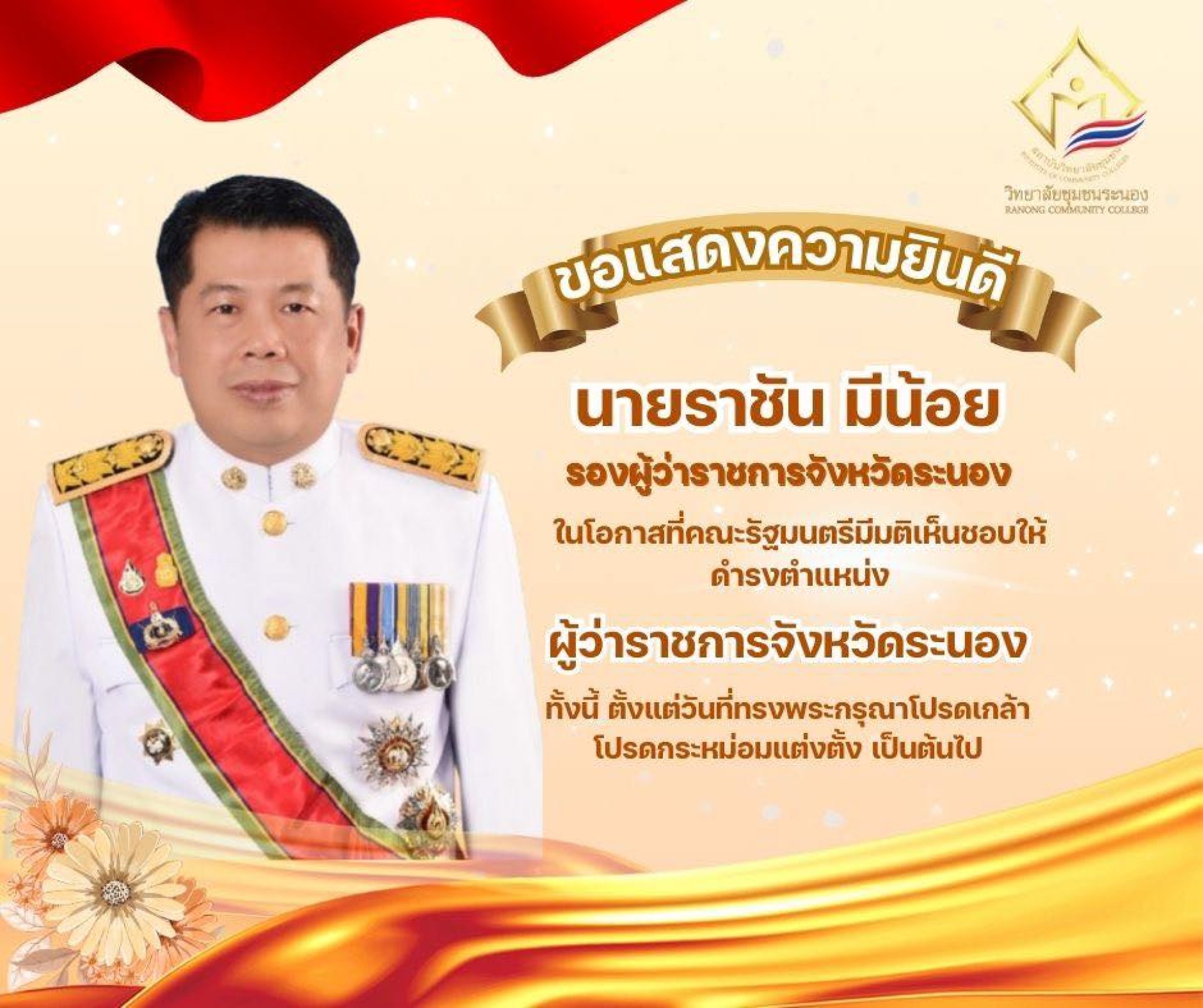 คณะผู้บริหาร คณาจารย์ บุคลากรและนักศึกษา วิทยาลัยชุมชนระนอง ขอแสดงความยินดีอย่างยิ่งกับ “นายราชัน มีน้อย” รองผู้ว่าราชการจังหวัดระนอง