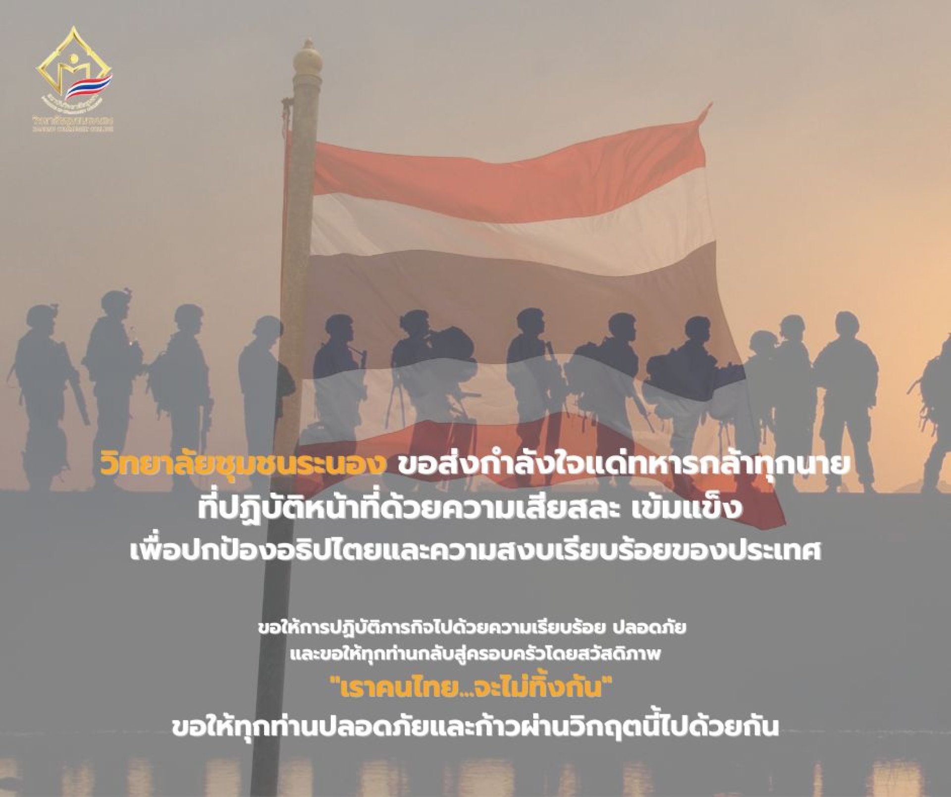 วิทยาลัยชุมชนระนอง ขอส่งกำลังใจแด่ทหารกล้าทุกนายที่ปฏิบัติหน้าที่ด้วยความเสียสละ เข้มแข็ง เพื่อปกป้องอธิปไตยและความสงบเรียบร้อยของประเทศ