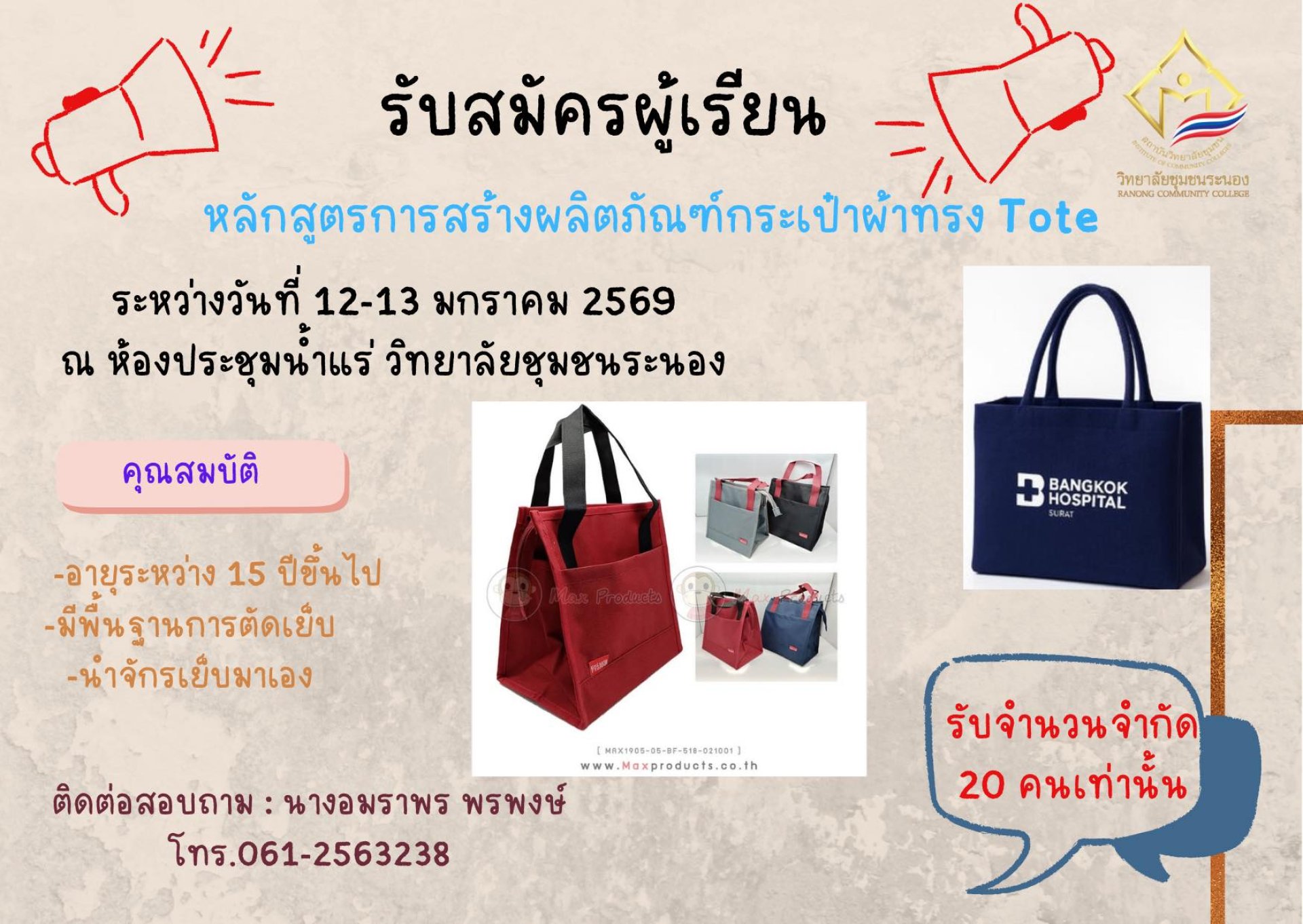 วิทยาลัยชุมชนระนอง ขอเชิญผู้ที่สนใจเข้าร่วมอบรม หลักสูตรการสร้างผลิตภัณฑ์กระเป๋าผ้าทรง Tote เพื่อเสริมทักษะอาชีพ สร้างรายได้ และต่อยอดงานฝีมือ โดยจัดการอบรมระหว่างวันที่ 12–13 มกราคม พ.ศ. 2569 ณ ห้องประชุมท่าแร่ วิทยาลัยชุมชนระนอง